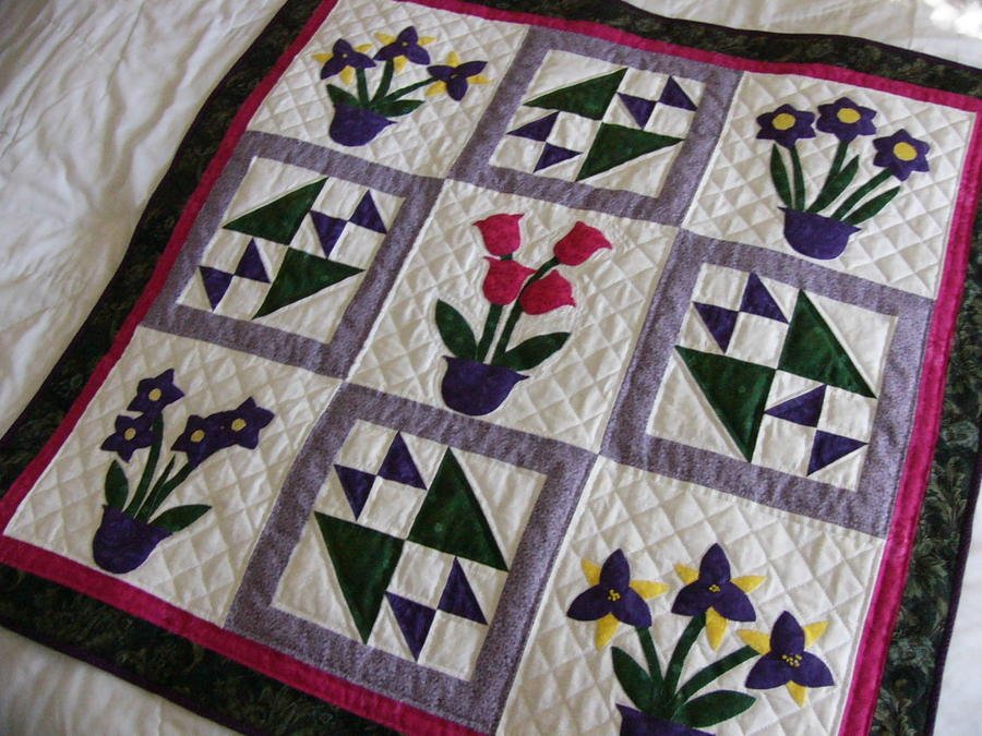 seamswiggly Spring - After my father passed away I wanted to make a "hopeful" quilt. I found this pattern in a quilt calendar I'd purchased and I fell in love with the design by Debby Kratovil. This is my first totally handquilted piece, and it took me a year to do it in my spare time. It is machine pieced, appliqued and bound. If I had to do it over, I would have done the binding by hand as I'm not satisfied with how it looks on the back. I may still rip it out and redo it. I made it smaller than the original, knowing that my spare time is rare if any at all. My sisters and I are looking after my mother now that she's 90, and I am happy to say that she and my grandmother were both quilters and I'm the only daughter that caught the "bug".