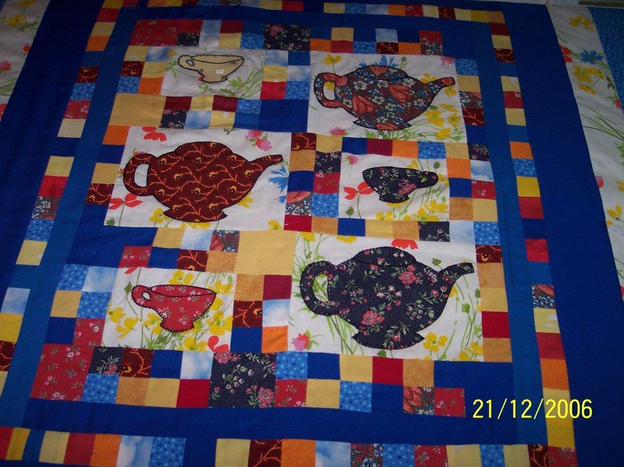 | Design Source - Description | A fat quarter quilt design. I made as a Thank you to my Ceramic Teacher . It was my first fusible web applique. |