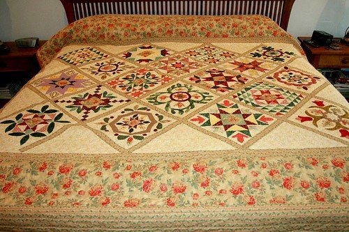 JANBLOCK Celebration Sampler - This quilt was made as a block of the month put on by my local quilt shop. It took me all of 2008 and I finished the quilting in 2009. Each block is either all applique, just block, or a combination of both. I really like the combination of block and applique. I modified the quilt pattern some by cutting the amount of blocks. I didn't want a large quilt. When I completed the quilt with most of the quilting done, I noticed that it was way to long for our queen size bed and just wide enough. So I added some side strips - in the quilt as you go method. Luckily I had enough fabric. My son and his wife now own the quilt and loots great on their bed.