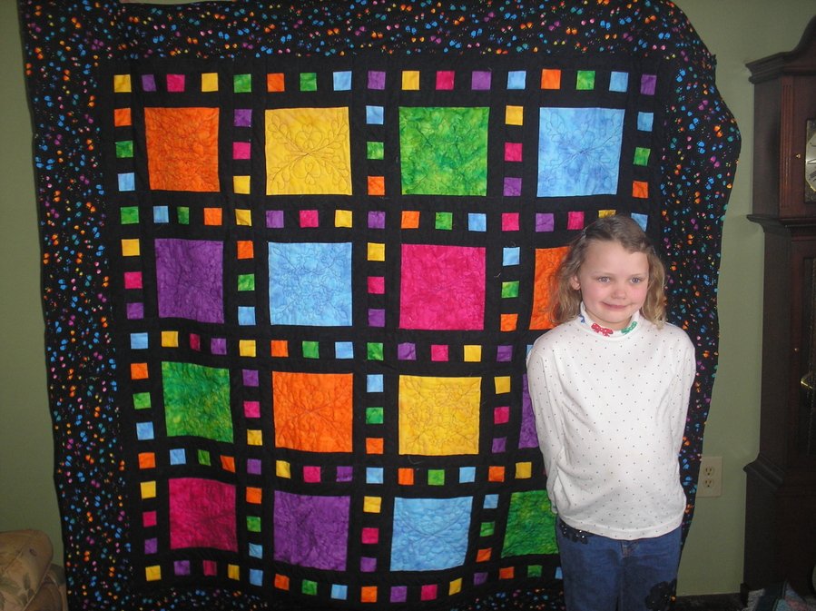 JaniceJ Slideshow - My granddaughter Sharon made this quilt with Grandma's help. We started it about a year ago and finished it just this week. Sharon pieced the quilt together and used the quilting machine to put patterns in each block. We are very happy with the beautiful colors and patterns!