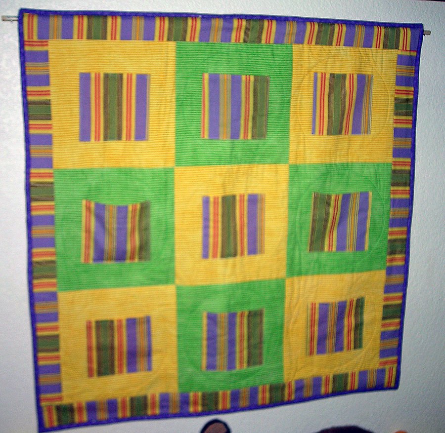 karabu Purple Pockets - The purple pockets are 5 inches square, the yellow and green blocks are 10 inches, and the finished size is 36 inches. I made it for my kiddo, and she enjoys it more that I'd hoped. She has small hard plastic toys she always wants to sleep with, but they get lost in the bed. Now they get tucked into their pocket for the night right next to her, and can be found again in the morning! Yea!