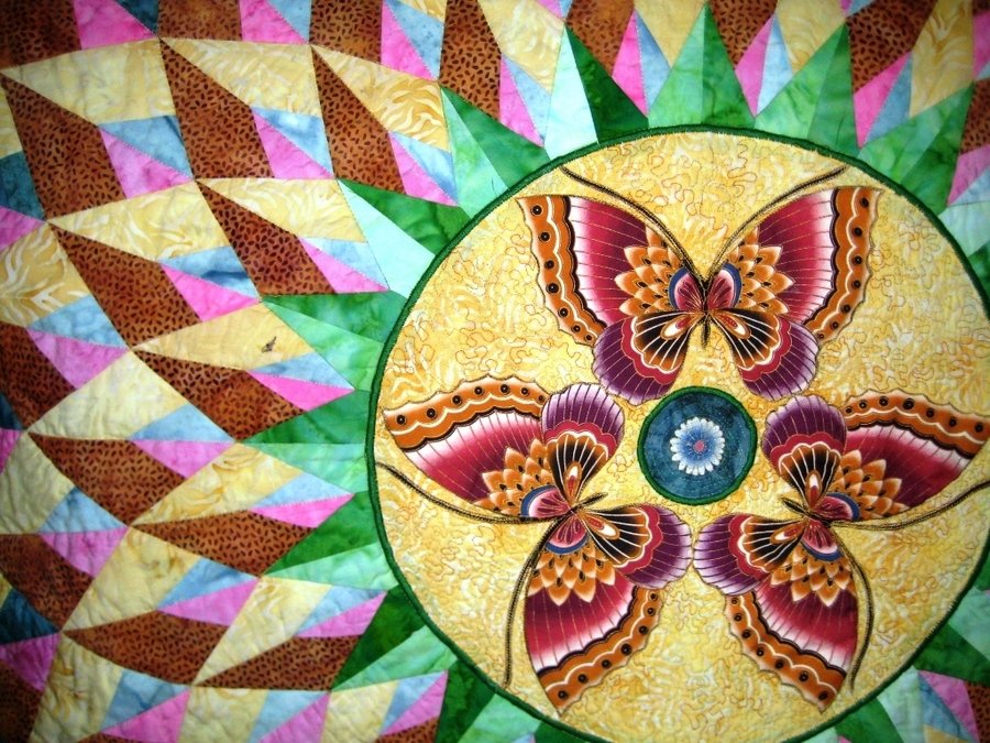 Flipper Center close-up - This is a close-up of the center of McMorris Wedding Quilt. The butterflies were cut from an asian fabric and trapunto was used to accent them. My daughter had butterflies as a theme for her wedding.