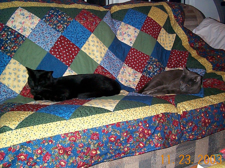 | Design Source - Description | This was my first quilt. I took a class at a local quilt shop. I used the feather stitch to quilt it in the ditch. My cats, Bonnie and Clyde, have inspected the quilt and given their approval. :) |