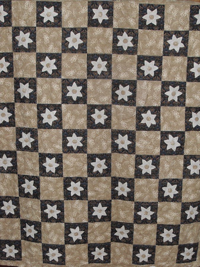 yankees42 Star/Flower - I hand appliqued the flower(that turned out to look like a star)block, when I worked the front desk of an inn during the quiet evening hours of my shift. This quilt is meaningful to me because I had a crush on the maintenance guy who's parents ran the place and now how many years later we are married! This one is not completed yet.