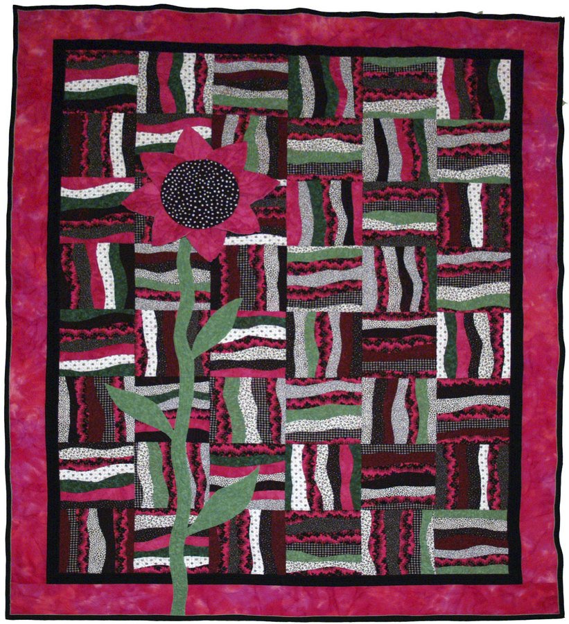 DeLynn Bloomin' Curves - I started with some "ugly" fabric for the color scheme. Sliced, shuffled, and piece the curved background blocks. The stem and leaves were cut free form and fused to the quilt top for raw edge applique. The flower head is 3-D stuffed petals and center. I started echo quilting around the flower and stem and then my BSR took control of my hands. This was really too much quilting for the busy background but it sure was fun to do.