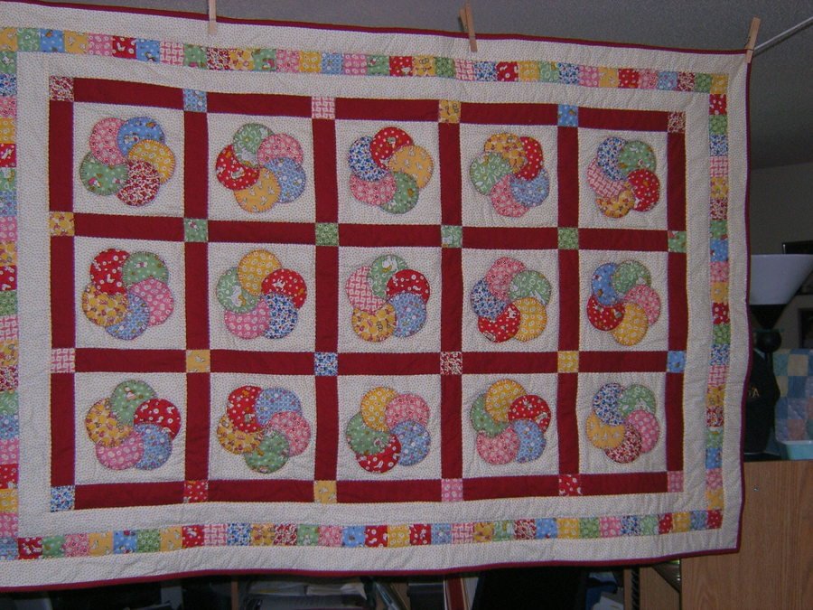 KarenGood Caden's Baby Quilt - This quilt I purchased the kit from Fons & Porters quilt shop online. I made this for my son's first child Caden Michael, born on June 19, 2006. This was the first one I made of Circle of life and it was made with the 1930's prints. I really enjoyed making this quilt as I did the blanket stitch by hand on the circles. I stitched in the ditch using fancy applique stitches on the quilt. Caden's mom really liked the quilt and had it on his crib but it was hardly used.