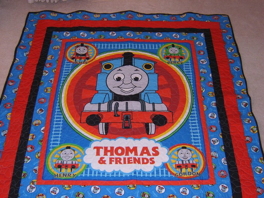 KarenGood Thomas the Train Quilt - This was a panel my grandsons mom bought at Wal-mart and asked if I could enlarge it for Caden's youth bed. I actually took and added borders to the front and back of the quilt and took the stitching out and then restitched following the original stitching on my Mega Quilter quilting frame. It came out pretty good and I was really happy with the results.