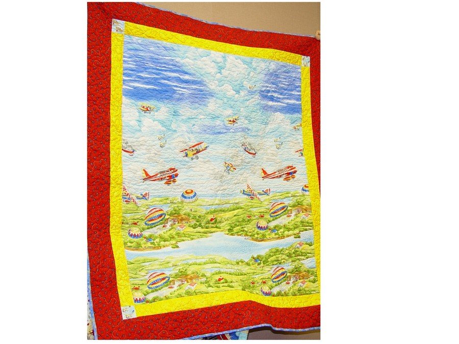 lakekids Up, Up and Away - This was made from a panel that was 18 inches high by WOF wide. I cut fussy cut around elements and added other commercial sky fabric and raw-edge appliqued airplanes into the other sky. This was made as a charity quilt.