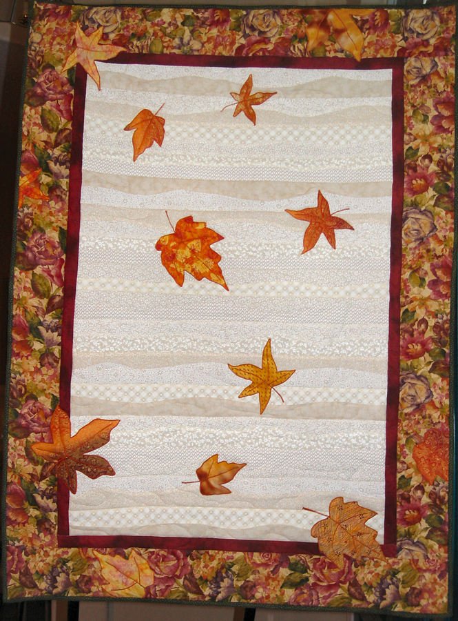 lakekids Dream of Falling Leaves - Being a native Floridian, fall is not something I have experienced here. I collected leaves on my daily walk and used them as patterns for the leaves on the quilt. I chose 'fall colors' and machine appliqued them on a 'wavy' pieced backgroung. The border fabric is used on the back of the quilt with green appliques leaves.