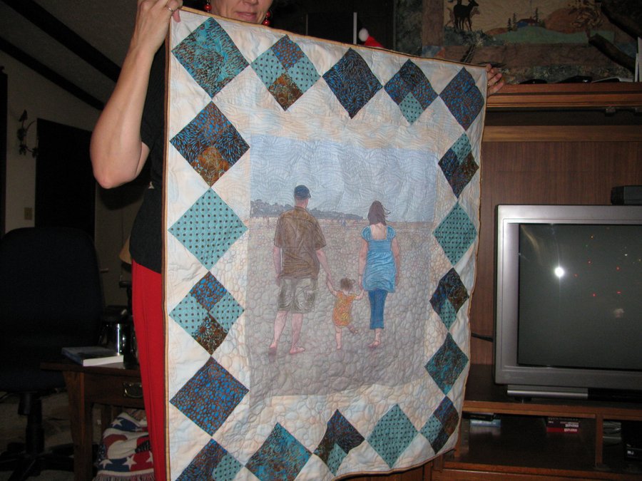 Musicmaker trip to the beach - I used a digital photo that represents one of my son's and his wife's favorite "poses", namely, walking away from the camera. I blew it up to a size that used 9 8.5x11 sheets of printer fabric, and once it was assembled, with a coordinating pieced border, I touched up the main figures in the picture with paintsticks and after heat setting, went ahead and free motion quilted, making pebbles on the beach, or streaks in the sky, etc. I gave this to them for Christmas.
