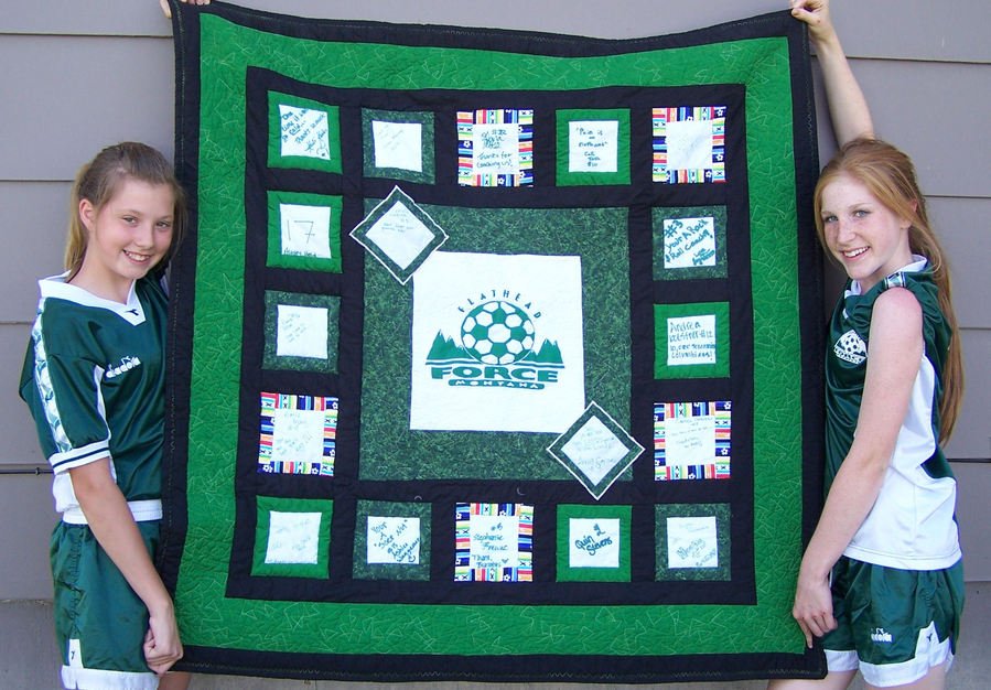 DixieT Soccer Coach Tom Quilt - This quilt was created for my daughter's soccer coach. My best friend and I decided to have each team member use permanent marker to write a message on the white squares and we used the team colors in fabrics to surround each white block. I used freezer paper, a craft knife, light box, and fabric paint to trace the logo in the middle of the quilt. Tom the coach was very passionate about not getting monetary gifts from the team members, but when we all gathered around him to watch him open this gift he teared up and said his grandmother was a quilter and it meant a lot to him!