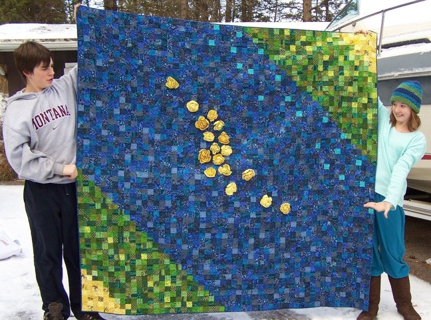 DixieT Roses In the Creek - I used Dina Pappas' method with a soft fusible backing that has a grid painted on it in 2 inch squares, making it easier to place each cut square and simply fold and sew a straight line. This quilt took FOREVER to make! Then, I got a crazy idea and decided to add my own touch with the roses, made of the yellow fabrics in the quilt, which I quickly tired of making after the first one, lol! The quilt turned out VERY heavy due to all the seams and the fusible backing, so I gave it to my stepmom who is always cold.
