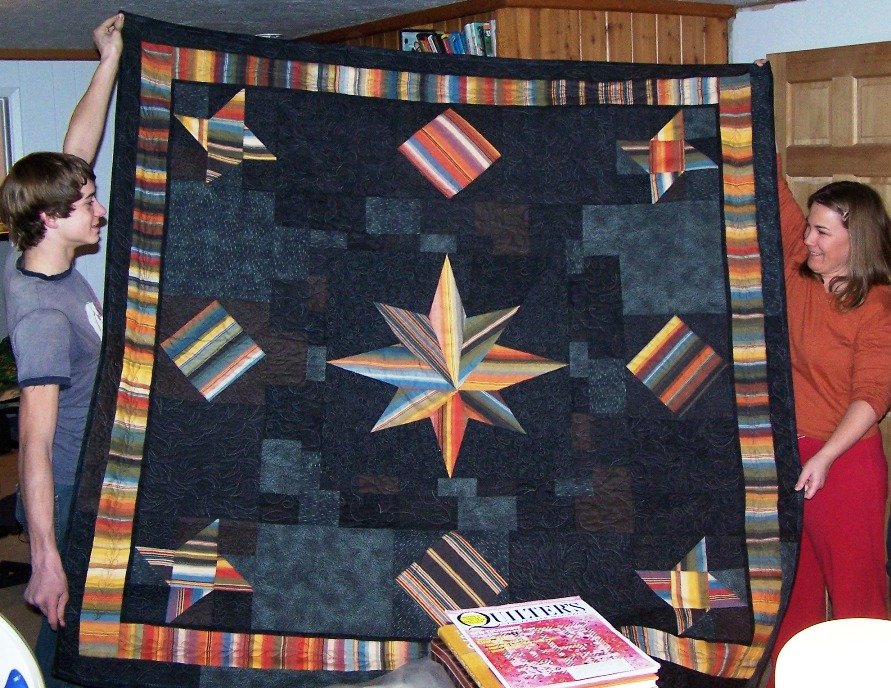 DixieT Dude Ranch Star - After finding a wonderful fat quarter pack of Moda's Dude Ranch fabric which has a loose weave, but awesome stripes that reminded me of growing up in New Mexico I drafted the middle star on graph paper and had the idea to fill in around the star with many different black fabrics. This was my first attempt at paper piecing and I really didn't know what I was doing and made a lot of mistakes! Once the middle was completed I decided to surround it with more dude ranch blocks and wanted something easy, so I used the half square triangle stars and the square in a square blocks. This project made me realize what a challenge piecing is because if you were able to look closely you would see the tips of the stars are cut off-BUT the middle star looks great!