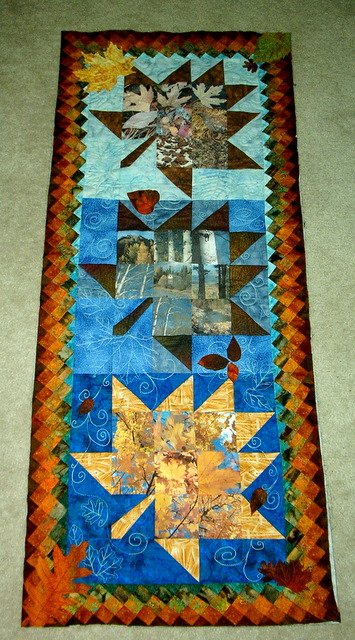 squeak Autumn at "the Cabin" - Using photos taken around the Cabin during the fall, I created leaf blocks on different shades of blue to match the changing sky in this area during the fall months. The border is a pieced border from the Border Workbook by Janet Kime.
