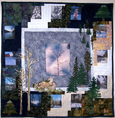 squeak Winter at "the cabin" - This wall quilt was made using photos taken around the cabin in the winter. I placed the photos in the center of the log cabin style blocks to border the center square. Two corner stones are pieced trees and then there are appliqued trees across the whole quilt. A family of deer are bedded down in the left bottom corner as well.