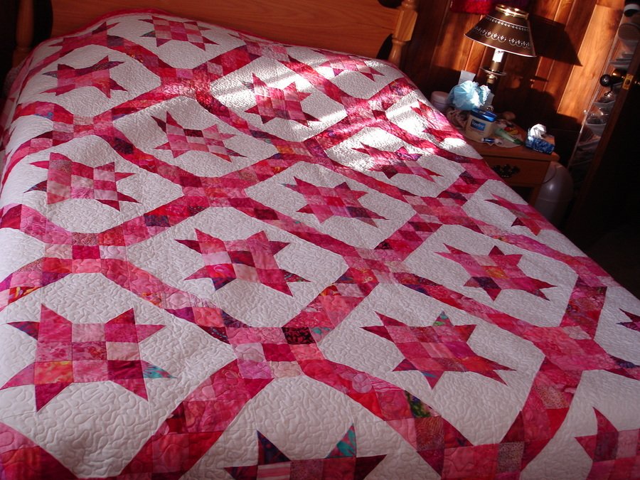 mlquilts Stars in Pink - A variety of pink batik fabric was used for most of the pinks, although other 100% cotton fabric was used. This is a pattern I borrowed from a friend. I only remember that one of the two blocks was Jacob's ladder.