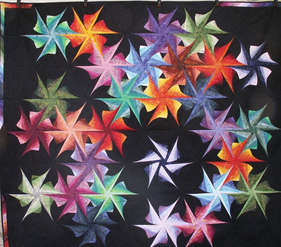 | Design Source - Description | Entirely Paper Pieced. My husband helped design this pattern using the idea from the book. There are over 130 triangles with 30 strips of fabric in each triangle. It's made from batik fabrics. For sale $2500. |