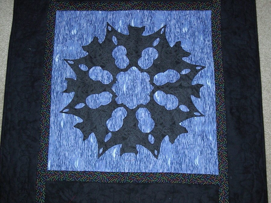 quiltwonder Going Batty - The pattern intrigues me because it is Hawaiian style but it had bats. Before I retired from 35 years of teaching elementary school, one of my favorite units to teach was on bats and I collected bat things. The quilting around the bats says chiroptera (which is the scientific name for bats) and bat sayings. I chose the fabric to look like bats flying over water at night.