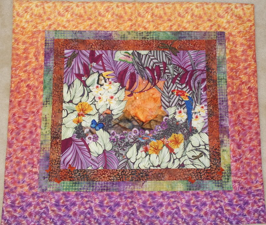 NHArtQuilter Sunrise - Eight years in the making, the foreground fauna design fabric has center cut out to create a window to see through to the hand-dyed sunset fabric and bali mountain scape individually cut and appliqued into place. Embellishments include appliqued beaded flowers and butterflies, birds and bugs.