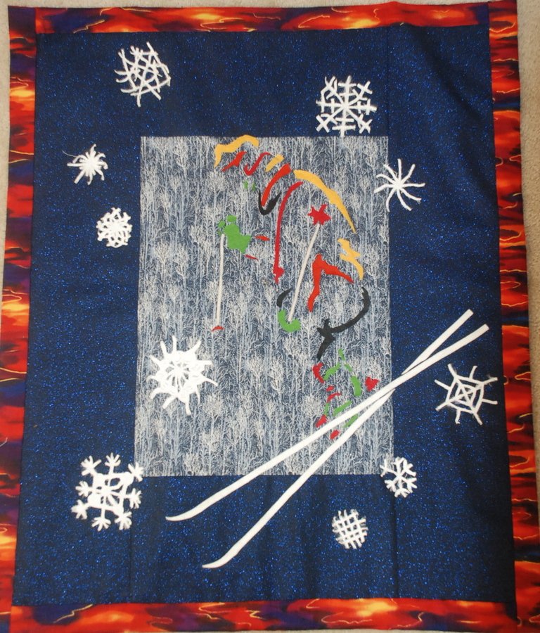 NHArtQuilter Downhill Skier - Letting the fabric lead me to the quilt, Downhill Skier appears almost ghost-like, catching some air, flying through the snow down the slope. The inset fabric is snow cover trees in blue tones. The large border midnight blue fabric sparkles as smaller border fabric is sunset like in its brief appearance making one think perhaps this skier is squeezing in the last run of the day.