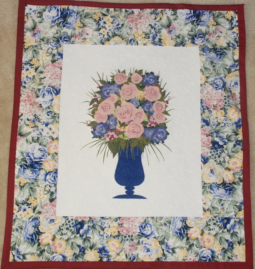 NHArtQuilter A Dozen Roses - Second in the series based on a technique seen on Alex's TV show. The flowers and vase are stabilized with two-sided fusible interfacing and cut to size and shape almost randomly to create the scene. The white center panel is stipple quilted.