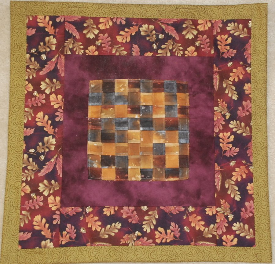 NHArtQuilter Shades of Autumn - Shades of Autumn's center panel is torn strips of hand-dyed cotton whose raw edges are ironed facing up, then woven into about an 8" square. Bordered with purple shades and olive greens and embellished with gold seed bead topped acorns.