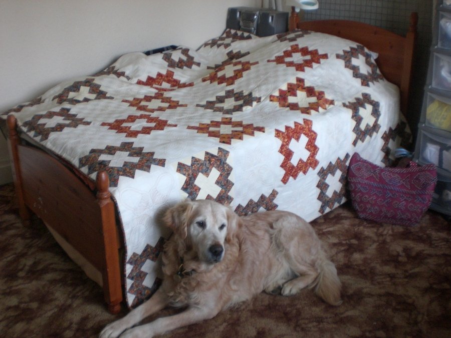 PosyP Acorns, Guest bedspread - Block taken from a vintage quilt seen in a mag. and made quilt as you go over a period of 2 years off and on with own quilting design.