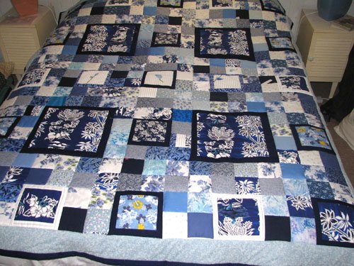 | Design Source - Description | My daughter wanted to use the blue hawaiin print in a quilt, so then I had to work out a way to incorporate it. The small squares are just 4". No pattern used, just kept trimming until they all fitted. |