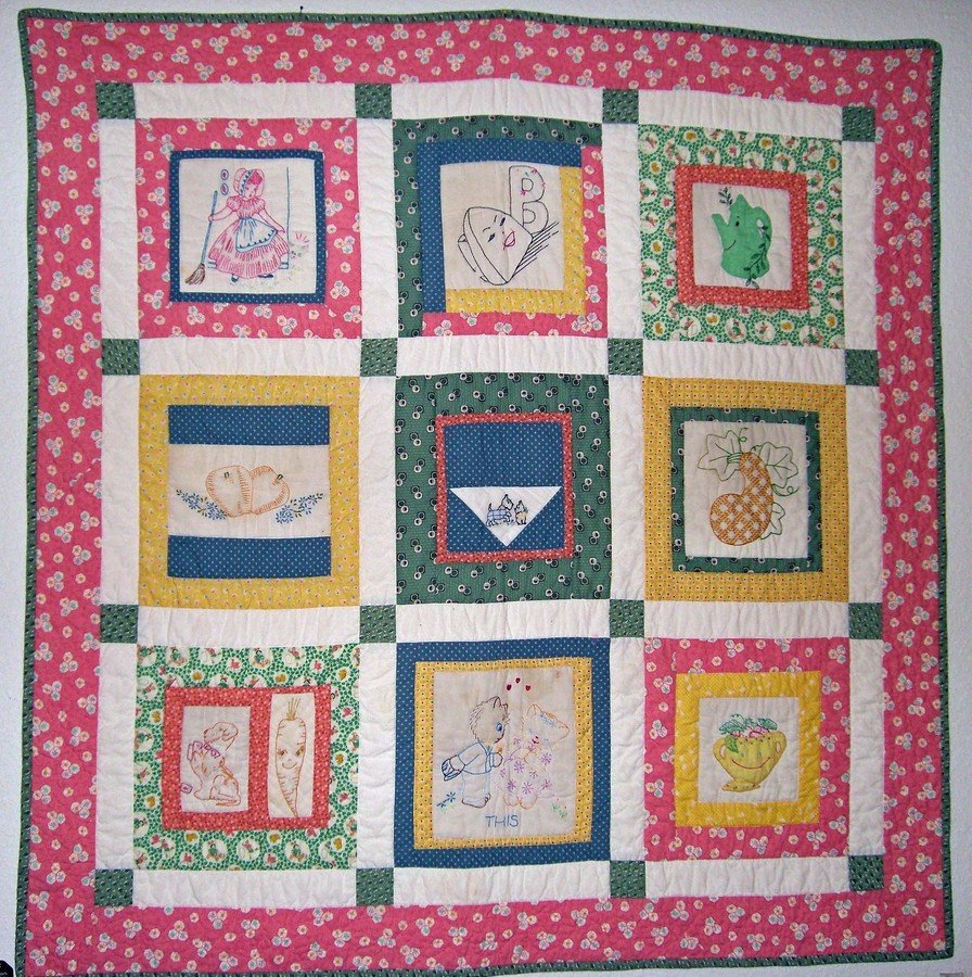 Quiltsalad Tea Towel Quilt - My "Granny" died in 1983 and these blocks were made from tea towels that she embroidered probably in the 50's and were used till I saved them from being thrown away. I cut out the least worn parts and sashed them with 30's reproduction fabrics and gave the quilt to my oldest Grand daughter when she was born in 1999 and I had made her crib quilt and accessories out of 30's fabrics also. The quilt still hangs in her room although the other 30's things are long gone.