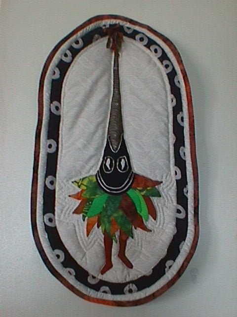 glendajean PNG tribal man 1997 - This was a group challenge & the challenge was some thing typical PNG. I made a PNG northen coastal man in his tridiational national costume. Made from cotton & snake skin!!!!! It is in the shape of a PNG Shield which is about 1/2 meter long.
