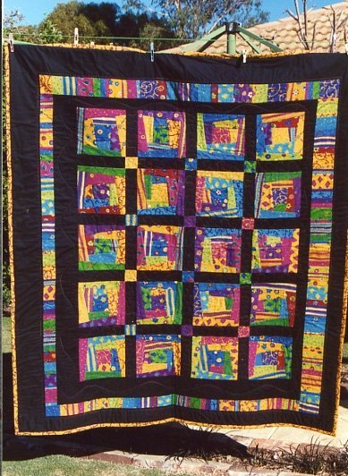 seejayjo Its a Crazy World - This range of Jan Mullen fabrics begged to be made into a quilt with a twist. A log cabin block was adapted so it was pieced off-kilter for interest. The pieced borders were also made in random sizes.