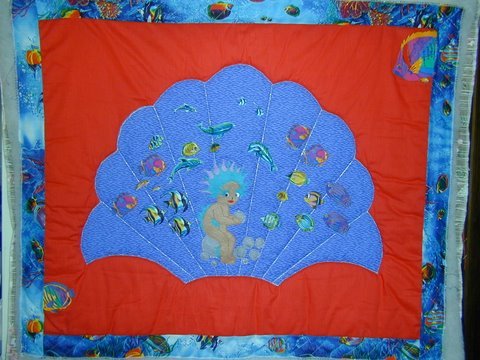 glendajean Bubbles - I saw this delightful baby mermaid in a colour book. After applique her & the fish I was not happy with it & left it for sevral months then I saw the clam shell one day around her mentally, I appliqued this on to the blue fabric & embrodiered the clam shape. It now hangs in a wee girls bedroom. Cheers Glenda Down Under