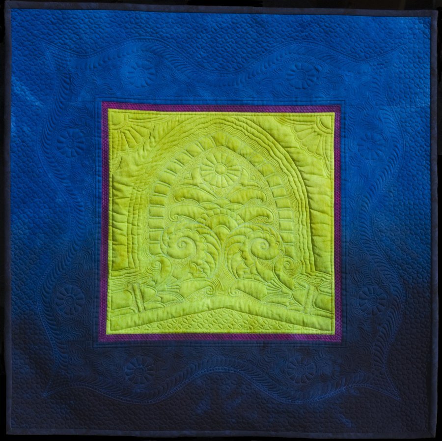 umknepp Rackham Details - This center motif in this quilt is a stone carving over the front doors of the Rackham Building on the University of Michigan campus in Ann Arbor. My husband photographed it, and I used an oversized copy machine to print the photo to size. I traced the outline of the carving, and then quilted it using silk threads. The fabrics in the quilt are hand-dyed cotton sateen from Jeanette Viviano. The colors are my version of UM's maize and blue. My quilting patterns were inspired by the work of Diane Gaudynski. The quilt was a gift for the Dean of the Rackham Graduate School.
