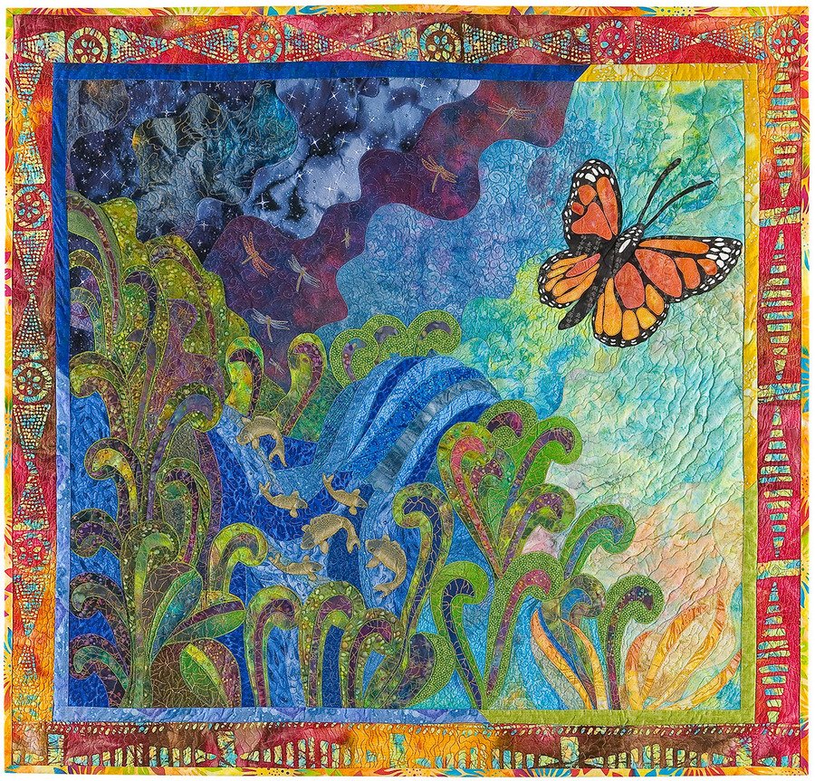 QuilterGirl "Stream of Consciousness" - This is an art quilt , hand drawn and designed by me, it is all raw edge applique finished with a blanket stitch. It is based on a memory of mine from my childhood. This quilt means the world to me, as it is my very first completed art quilt, it was a semi finalist in the AQS Paducah Show in 2008. It was also accepted into the Pennsylvania National Quilt Extravaganza in 2007. One very unique thing about this quilt is the "face" that appears in the upper left mid center of the quilt, I did not plan the design that way, it just happened to be a combination of the fabric pattern and the quilting , and I did not notice it until the quilt was completed! But it appears that the "night sky" is a female looking down on the emerging butterfly...pretty cool! Photography by Gregory Case Photography.