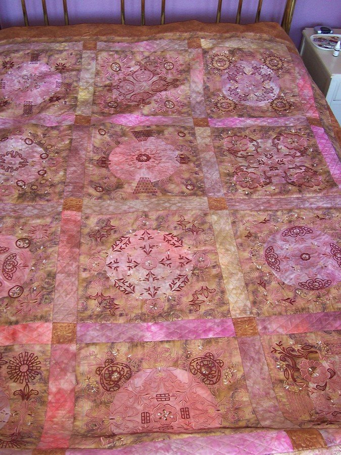 | Design Source - Description | After piecing in the circle, each block is embroidered ion 8-9 hoopings. My colors are quite different than those called for, but I think they work well. I used my embroidery machine and learned a lot. |