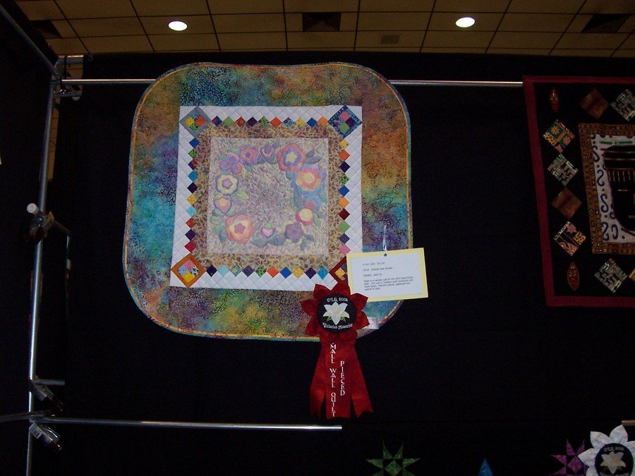 Sallyfly Shadow Wreath - The flowers are cut and fused, then appliqued with decorative thread used to show veins, leaves, etc. Then the whole center is covered with organza, borders added, and quilted heavily. I used a flange in the final border and scalloped the edge. Our quilt guild selected this design to make a queen sized raffle quilt benefiting the humane society.