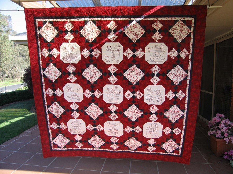 Raynor Red Splendour - I designed the quilt based around some embroidery designs by Renee Fallon for Northcott Fabrics. These designs were worked in pearl cotton to give them some depth.