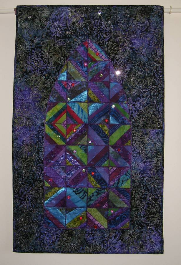 marianhelen Starry Starry Night - I was inspited to make this wall hanging having seen many photos of quilts with stained glass windows. It is s Quilt as you go method starting off with 6" squares using the strip method. I zig zagged the squares together and then cut the shape of the winodw. I couched purples cord to make the windows and covered the window with organza and stiched in place. I used silver metallic thread to give a stary like sky.