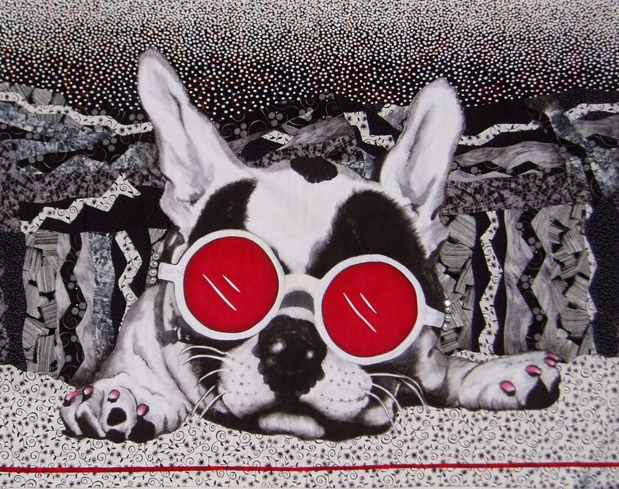 pblair Life is Good - Life is Good celebrates canines ability to chill out... something we humans seldom do. I follow the "Legally Blonde" film school of problem solving. When Life gets crazy... I get my nails done... so this lil' pup did too! Look closely at those nails. The main image is painted with inks, the background and foreground are collaged and fused printed fabrics.