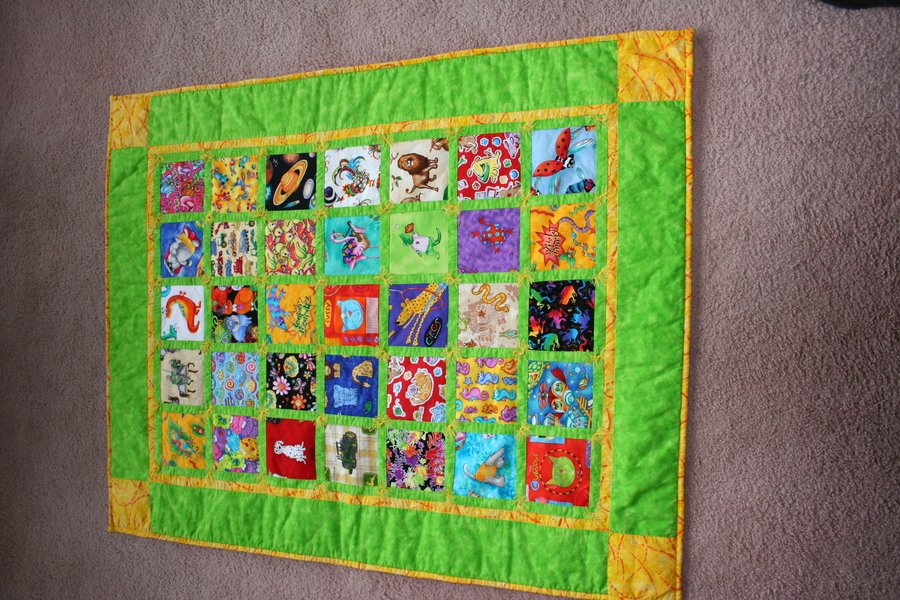 | Design Source - Description | I frequently fussy cut novelty prints and sash with bright green and yellow accents. Nice pop and gender neutral (if you like neon green :-) ) Minkee on the back to cuddle up with. |