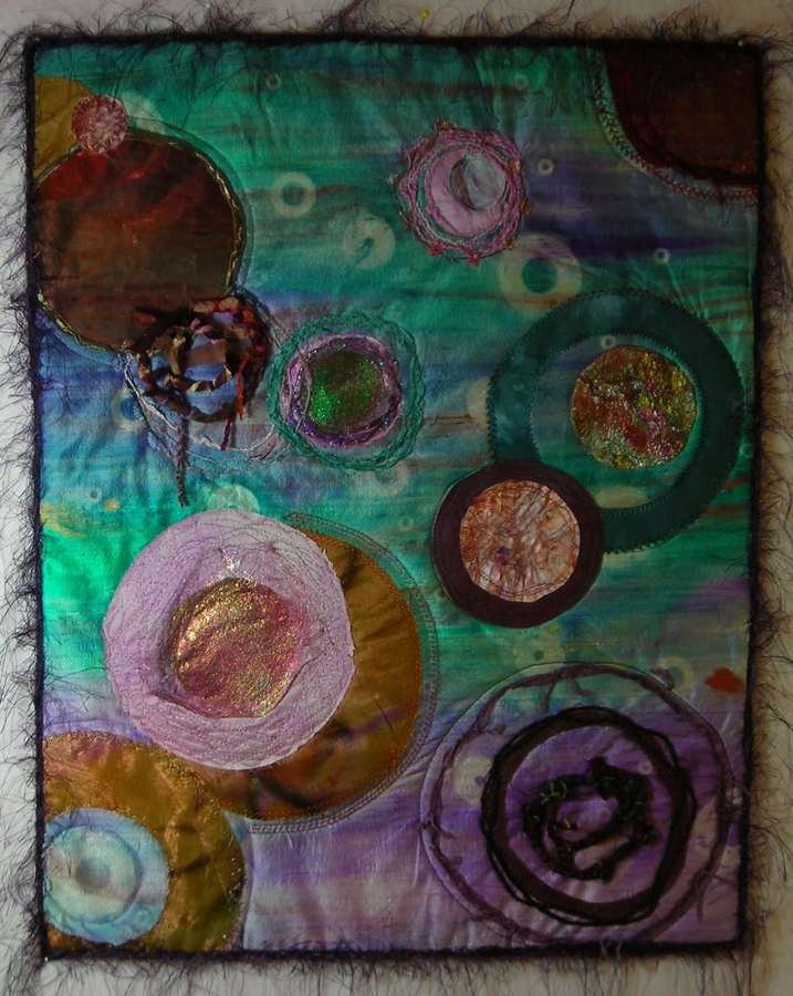 lizquilts Journal Quilt 2007 - Entry for 2007 Journal quilt project at IQA in Houston. Techniques used from the book Creative Quilting: Sunprinting/painting; hand dying; couching; painted/heated tyvek; angelina fibers; circles using thumbtack to pivot the fabric.