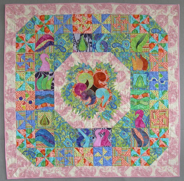 DBLTurtle Nesting - This quilt is based on a drawing from my sketchbook of "nesting embryo shapes". I used EQ6 to design the quilt. It was originally made for the Benartex Piece, Love and Quilts Challenge, and was a finalist in the contest. (It incorporates fabrics from the Benartex Woodstock and City Girl collections) It has also been shown at the 2008 Pacific International Quilt show, and will be exhibited at the 2009 Quilter's Heritage Celebration in Lancaster, PA, April 2-5. I gave a photograph of my quilt to my doctor's office, and they displayed it in their examining room, and it has brightened many a patient's visit.