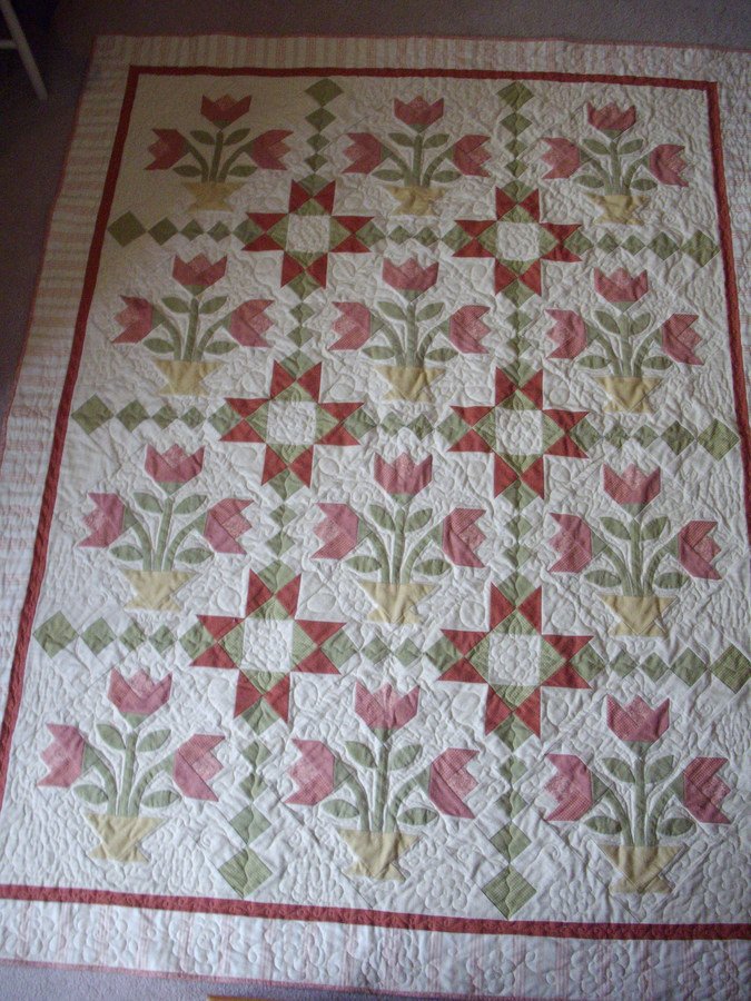 LeeMarie4Q Tulips From the Past - I saw the finished quilt in a vendor booth at the Minnesota Quilt Show in 2008. I fell in love with the colors and the fact that it was all done in cozy flannel. I bought a kit so I can't take any credit for choosing the beautiful colors. I machine quilted this on my Gammill. I'm new at long arm quilting and I was pleased that it turned out as well as it did.