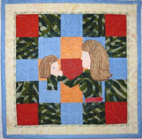 momof2 A Mother's Helping Hands - This is the quilt I made for the helping hands challenge. It is made enitrely of the Mali challenge fabrics, except for the faces, the border and the small red belt on the mom.