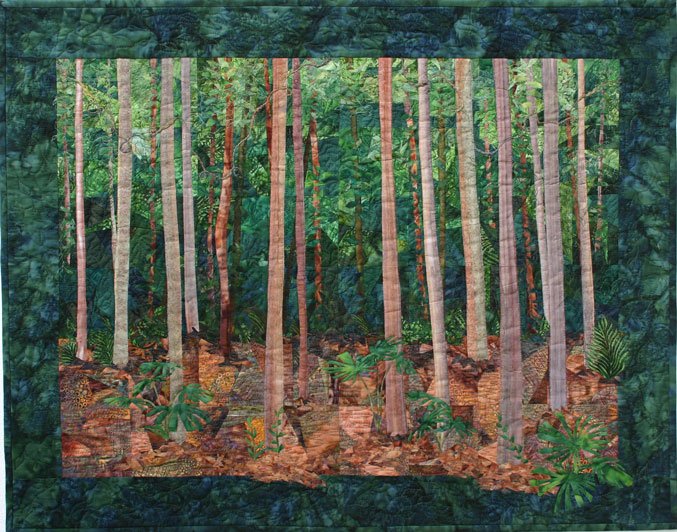 | Design Source - Description | Rain forest trees on a foundation pieced background. Embellished with raw edge applique and fabric snippets. Inspired by walks in the tropical rain forest here in Borneo. |