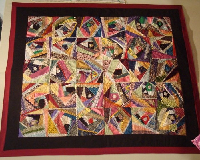 ib2qtpie Crazy Cousins - Crazy Quilt constructed from old clothing, flour sacks and scraps. Embellished with bits of lace, trims and buttons.
