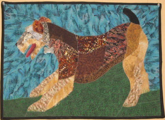 momof2 Toby's Little Dance - I adapted Sharon's pattern to show the little dance my DH Welsh Terrier used to do whenever his feet met grass. He passed away three months before I made this quilt, and thought my DH would really like this. I attached Toby's old tags to the quilt, and now this hangs in our family room.