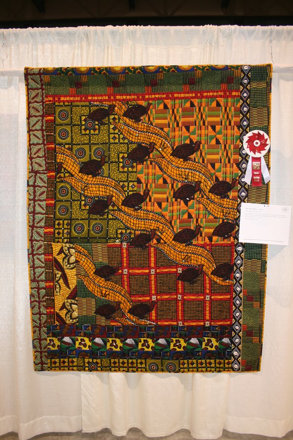 MarietNieskens Afrika 4 - I was in Afrika and was really intrigued by the little hens that ran every where(loopvogels in Dutch) Then I saw the fabric with the little birds but how to give the elusion of them running. I think I did it the quilt is a reminder of Africa the colors and the birds.
