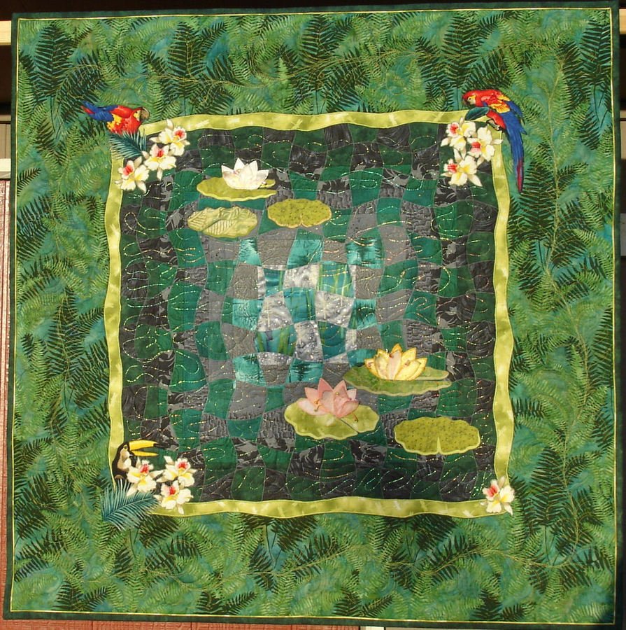 Quiltlovr1 Tropical Hide-Away - Took class on "Simply Stunning Woven Quilts" (Book by Anna Faustino) and quilt evolved from there. Water lilies designs from Jan Krentz's "Diamond Quilts & Beyond"