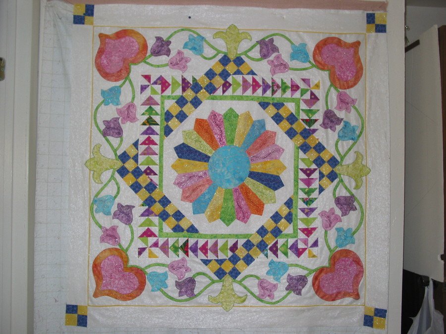 latpatt Ostrich Challenge Thousand Islands Guild - I made this quilt as a guild challenge, we were assigned a round with different requirements each month. Two colors, triangles, applique etc. and you could put your head in a hole and be an ostrich and not do a round, hence the name Ostrich. I put an ostrich face o the front and the body on the back. To make the head hair I used anglique fibers and only fused a portion so they were left fluffy.